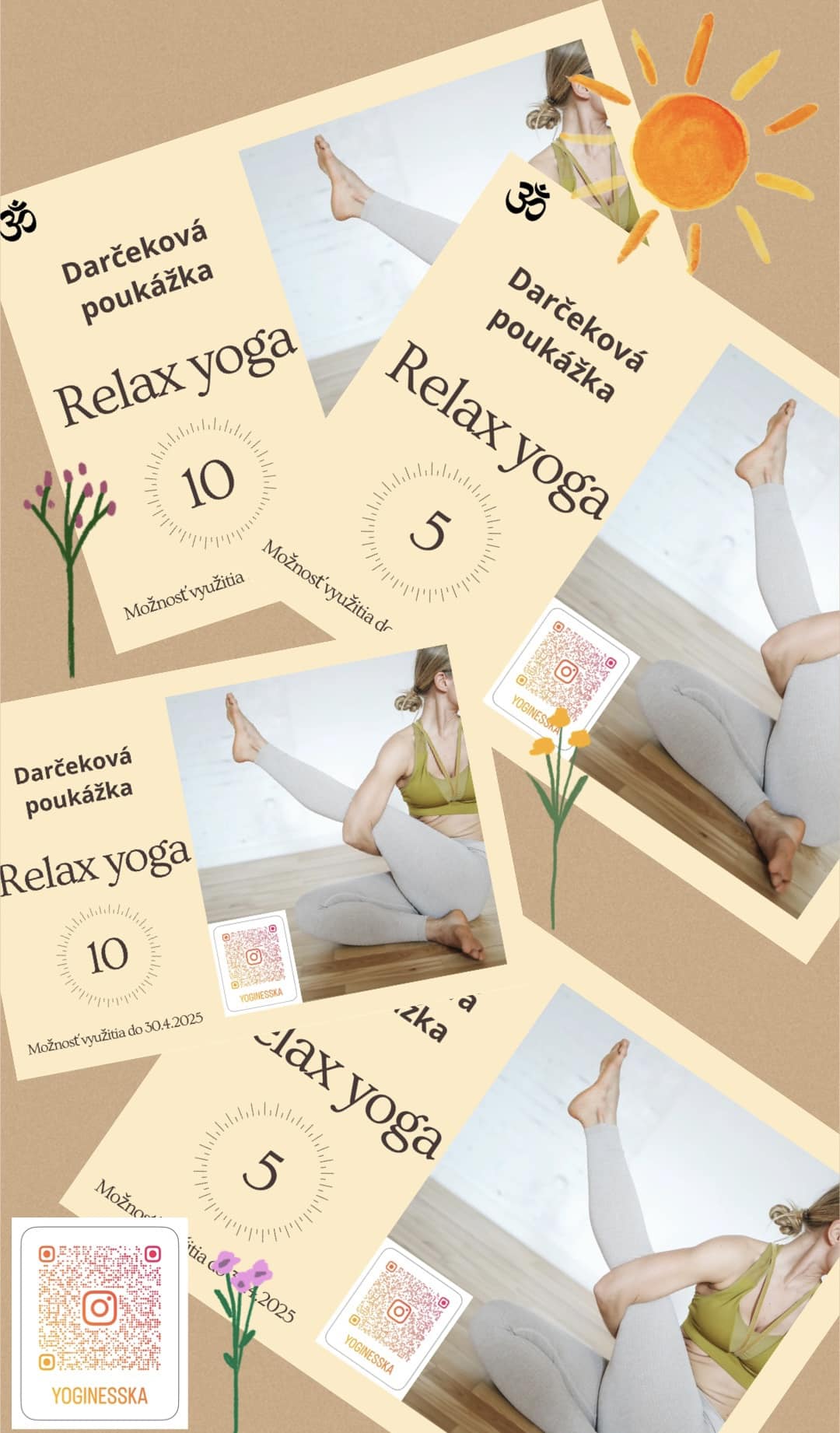 Ak by ste chceli niekoho obdarovať príjemne stráveným časom a chvíľkou pre seba, vytvorila som darčekové poukážky na 5 vstupov na relax jógu na ktorékoľvek z vyššie uvedených miestností.